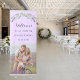 A chic violet colored background. Decorated with lavender florals, flowers and eucalyptus greenery. Personalize and add your photo, names and the wedding date.
