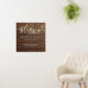 Glowing gold lanterns and light string with welcome sign on dark brown rustic wood.