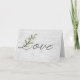 LOVE text in an elegant script font with green leaves on white birch tree texture.