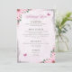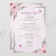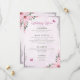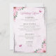 Description: A beautifully designed wedding menu featuring a pastel pink floral border with butterflies and greenery accents. The menu is divided into sections: Starters (Garden Salad with Balsamic Vinaigrette, Tomato Soup with Basil), Main Course (Grilled Chicken with Garlic Mashed Potatoes and Steamed Vegetables, Pan-Seared Salmon with Rice Pilaf and Asparagus, Vegetarian Pasta with Fresh Tomato Sauce and Parmesan), Desserts (Vanilla Wedding Cake with Buttercream Frosting, Chocolate Brownies, Fresh Fruit Salad), and Drinks (Sparkling Water, Lemonade, Tea & Coffee). The elegant typography and soft color scheme create a romantic and inviting atmosphere.