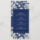 Elegant wedding dinner menu in stylish dark navy blue and cream off white classic floral damask pattern, customizable with your dinner details, available in a wide range of matching wedding products.