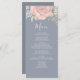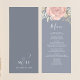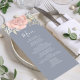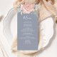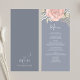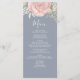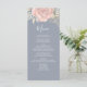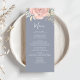 This design features an elegant modern simple wedding menu card with elegant calligraphy script, simple blush pink rose floral and greenery, and a blue background, the perfect reception decor