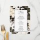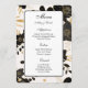 This wedding menu card is shown on basic paper in a lovely elegant black and metallic gold floral print. Script and standard text in a Black color.