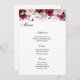 This wedding menu card is shown on basic white paper in a lovely pink and plum color roses print. Script and standard text in a Black color.