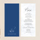 This design features a wedding menu card, with an elegant calligraphy script, with classic blue floral design, with a simple meal course, and ampersand monogram on the back.