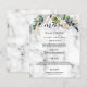 An elegant, modern and wedding menu. A marble stone print background decorated with eucalyptus greenery and golden leaves Personalize and add your names, date and the wedding menu. Black colored letters. The word Menu is written with a trendy hand lettered style script with swashes. Back: white background and golden faux glitter drops.