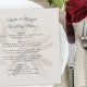 Round wedding menu template with southern magnolia design. Pinkish beige color with dark green text to customize in two places. The title is script font with names of the couple and menu title. The entrées and all menu offerings are added in one paragraph. This design works on the round or square shape. Remove the envelope option as desired.