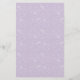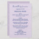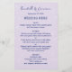 Lavender purple wedding menu template. Hibiscus flower outlines make a light pattern over the background. Text is dark navy blue with names of the couple at the top with date and menu title. Add all menu items in a paragraph as you choose. The sample wording has each section started with uppercase lettering and spaces between sections. The back of the paper is a darker purple with the same floral pattern.