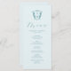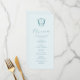 This elegant wedding menu features a simple monogram crest with the bride and groom's initials. The word "Menu" is set in calligraphy script. Use the template fields to add your custom menu items in turquoise over a pale blue background. Perfect for weddings, rehearsal dinner, engagement parties and more.