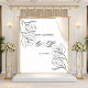 A romantic and elegant wedding backdrop featuring a minimalist design with delicate floral illustrations and the couple's names and wedding date elegantly scripted in black on a white background.