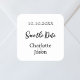 A Save the Date sticker for your wedding. A stylish white background, black text. Personalize and add your names and wedding date.