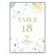 Wedding Table Number Card | Rustic and modern blue and gold paint splatters sets off the wedding tables in style. Reverse is a the same. Customize text, font style, color and size. Original painted artwork created for the BarefootBride™ by © WhimsicalArtwork™ - This is part of a complete Wedding Stationery Suite with matching wedding, baby shower and other event stationery. #watercolor #wedding #denimblue #blueandgold #tableNumber
