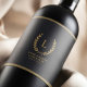 This elegant black and gold wine bottle label features a modern monogram surrounded by a laurel wreath, showcasing the couple's names and family name. The design also includes the wedding date, framed with a luxurious Greek key pattern at the top and bottom. Perfect for a stylish wedding celebration, this personalized label adds an upscale, timeless touch to any wine gift or keepsake. The sophisticated typography and gold accents make it an ideal choice for the modern couple looking to celebrate their union with elegance and class.