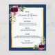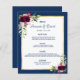 An elegant bohemian boho style wedding menu card. Feathers and lush watercolored roses in burgundy. Templates for your names, date and the wedding menu. A faux gold frame and a chic navy blue and white background. Navy blue colored letters.