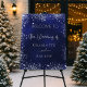 A navy blue background, decorated with faux silver glitter dust. The blue color is uneven. With the text: Welcome to The Wedding of. Personalize and add your names.