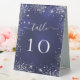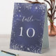 Simple and elegant. A navy blue background, the blue color is uneven. Decoratedwith faux silver glitter, sparkles. Personalize and add table numbers. White text.