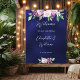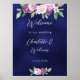 A navy blue background, decorated with watercolored roses in pink, violet and purple. With the text: Welcome to our wedding. Personalize and add your names.