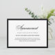 These elegant, old money style wedding or event postponement or cancelation announcement cards feature a dramatic black border and a black and white text design. The formal script says "announcement," and there is enough room to provide a brief message of explanation to your guests. There is a mix of classic black text and modern calligraphy for a classy and minimalist design.