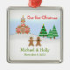 A Christmas ornament for your first year as husband and wife featuring a snow scene complete with gingerbread bride and groom in front of the gingerbread house church where they just got married! Snow covered yard, evergreen trees, and Christmas tree complete the scene. Personailze the text.