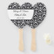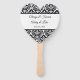 This wedding paddle fan is shown with a elegant black and white damask print and sample names and date.