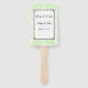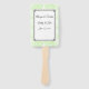 This wedding paddle fan is shown in a mint green floral background print with sample names and date, customize and change the text to yours.