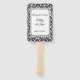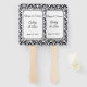 This wedding paddle fan is shown with a elegant black and white damask print and sample names and date.