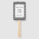 This wedding paddle fan is shown with a elegant black and white damask print and sample names and date.