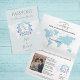 Modern and Elegant World Map Invitation Wedding Destination, like passport with a dusty blue watercolor floral crest monogram
