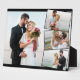 Create your own wedding photo plaque with 4 of your favorite pictures. The photo template is set up to create a photo collage with one main background photo, overlaid with the remaining three photos in a vertical zigzag. Your pictures are displayed in landscape format with black frames.