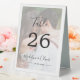 A simple photograph with a modern elegant script is the design for this Wedding table card.