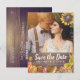 Save The Date Wedding Invitation Photo Postcard Templates - Elegant Autumn Maple Leaves, Pumpkins and Sunflowers Watercolor Flowers on Rustic Wood Background.