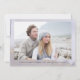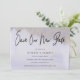 A soft blue / purple watercolor wash covers both sides of this elegant Save Our New Date card. Gold glitter decorates the top on the front and bottom on the back. On the front, Save Our New Date is written in a large modern script font and then your new wedding details follow in an elegant serif text. Your favorite photo is on the back. Your names, wedding date and location are below.