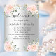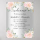 A welcome/program, timeline poster for a wedding. A stylish faux silver looking background decorated with blush pink and white flowers. Personalize and add your names and the details. Black letters.