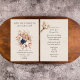 A picture of the bride and groom (replace with your own), surrounded by a muted tan floral wreath, on a creamy background.