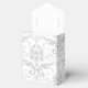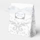 Shown here is the tent style favor box. This box coordinates with the temple wedding invitation and reception invitation. Has the Silver Coronation pattern on all sides of this favor box. Personalized names of the newlyweds across the top flap. To personalize the names, click the "unfolded" button after clicking customize button. Customize this item to your desires.