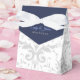 Shown here is the tent style favor box. This box coordinates with the temple wedding invitation and reception invitation. Has the Silver Coronation pattern on all sides of this favor box. Personalized names of the newlyweds across the top flap over Sapphire Blue. To personalize the names, click the "unfolded" button after clicking customize button. Customize this item to your desires.