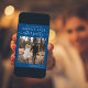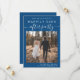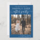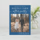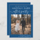 Modern classic blue save the date announcement for your elopement or private wedding reception that features your photo and "Happily Ever After Party" in a mix of simple white typography and a chic white script with swashes. Under your photo, add your first names and reception/party date and location.