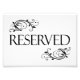 This classic table card features the word "RESERVED" in a straight block font with large swirly embellishments finishing two corners . It's the perfect sign for a table that needs reserving for the head table or special guests.