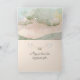 Wedding bands in a seashell with flowers and net in abstract heart frame on pink and green watercolor background.