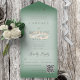 AVAILABLE WITH OR WITHOUT A QR CODE TO SCAN. This simple yet elegant design has a modern look, with two interlocked gold wedding rings on a soft white blur overlay on a soft emerald green background. Personalized All-In-One invitations are a unique combination of both a beautifully printed custom invitation with an easy to tear off perforated RSVP postcard. And they are so easy to use! You simply fold, then seal the back flap with the three included clear stickers, and mail. And when your guests receive your custom invite, they just tear the perforated RSVP Card off and drop it back in the mail to you!