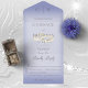 This simple yet elegant design has a modern look, with two interlocked gold wedding rings on a soft white blur overlay on a periwinkle background. Personalized All-In-One invitations are a unique combination of both a beautifully printed custom invitation with an easy to tear off perforated RSVP postcard. And they are so easy to use! You simply fold, then seal the back flap with the three included clear stickers, and mail. And when your guests receive your custom invite, they just tear the perforated RSVP Card off and drop it back in the mail to you!