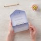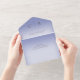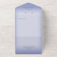 AVAILABLE WITH OR WITHOUT A QR CODE TO SCAN. This simple yet elegant design has a modern look, with two interlocked gold wedding rings on a soft white blur overlay on a soft periwinkle blue background. Personalized All-In-One invitations are a unique combination of both a beautifully printed custom invitation with an easy to tear off perforated RSVP postcard. And they are so easy to use! You simply fold, then seal the back flap with the three included clear stickers, and mail. And when your guests receive your custom invite, they just tear the perforated RSVP Card off and drop it back in the mail to you!