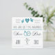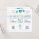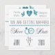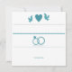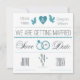 An off-white and teal announcement with hearts, doves, wedding rings and a "Save the Date" message.