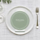 Fully customizable elegant wedding round plate guest place cards feature a minimalist design in rustic sage green & white. Delight your guests with personalized cards featuring each guests name & table number! The opposite side is solid green. Customize our simple to use template with your own wedding details! Order each card separately after customization of guest name with the template.
