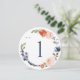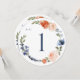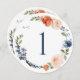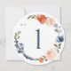 Orange, Peach & Blue Round Double-Sided Wedding Table Numbers: These unique round wedding table numbers feature a beautiful orange, peach & dusty blue floral wreath. Change your initials at the top left of the wreath. What you change on one side will automatically change on the other.