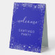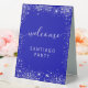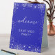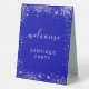 A welcome sign for a party. A royal blue background. Decorated with faux silver glitter. Personalize and add your name. White text.