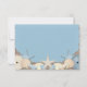 A beautiful destination wedding RSVP response card with an exotic beach theme. A pretty sand texture background pattern in neutral cream tones and shades of ocean blue is scattered with lots of little beach pebbles. On top of the pebbles are a variety of sea shells, sea urchins, starfish and pearls.