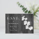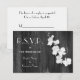 A wedding RSVP card featuring a black and white image of white orchids over barnwood.