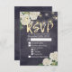 Wedding RSVP Reply Card Templates - Elegant White Hydrangea Flowers and String Lights on Vintage Navy Blue Floral Linen Background.