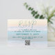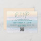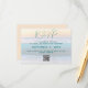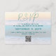 Beach wedding reply cards with QR code for wedding website. Ask guests to reply to the invitation online. Include a date and other information in teal blue text over an ocean sunrise background image.